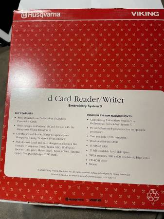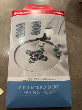 Mini Embroidery spring hoops, D- ca rd reader/writer, stitch d-cards E1 and M1 and others. All New, will sell together