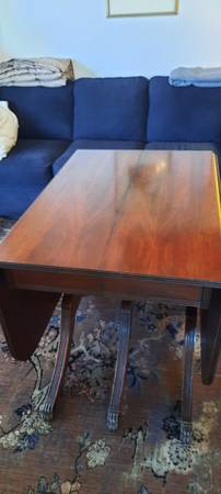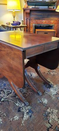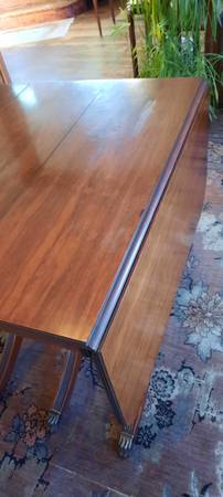 Vintage Phyfe-style drop leaf dining table in nice condition. Rectangular shaped top resting on three pedestals with clawed feet. The set includes the table, two extension leafs, and table pads. Seats 4-6 without extensions.