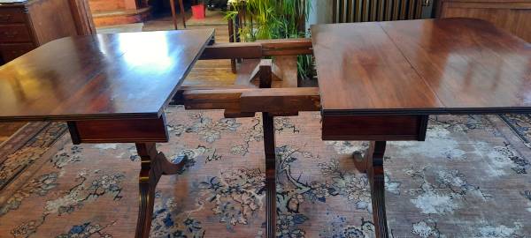 Extension is a Jefferson Woodworking slide to open and extend the table. Each insertable leaf extension measures 10" x 38".