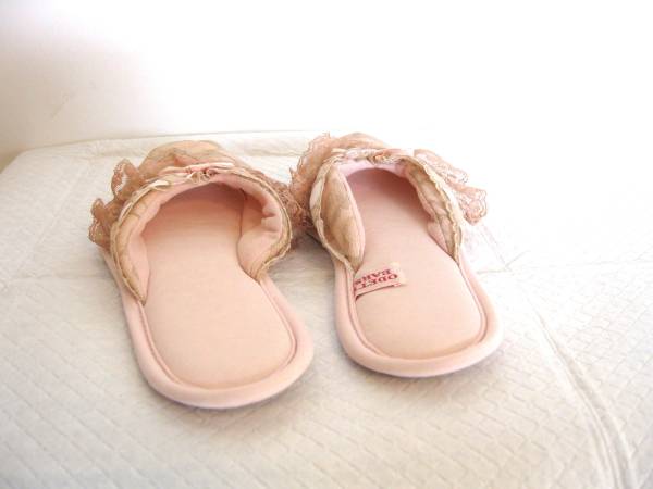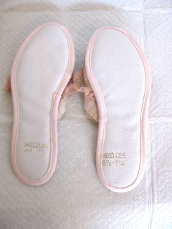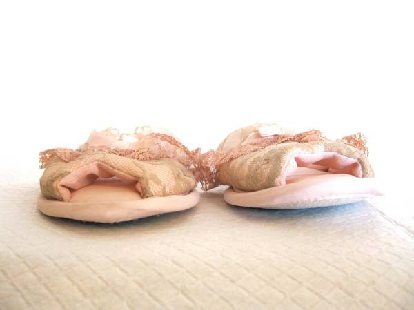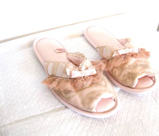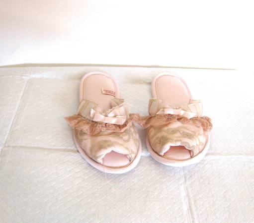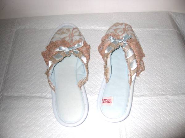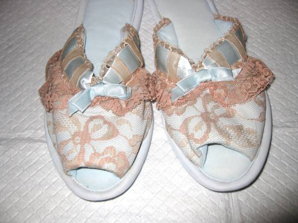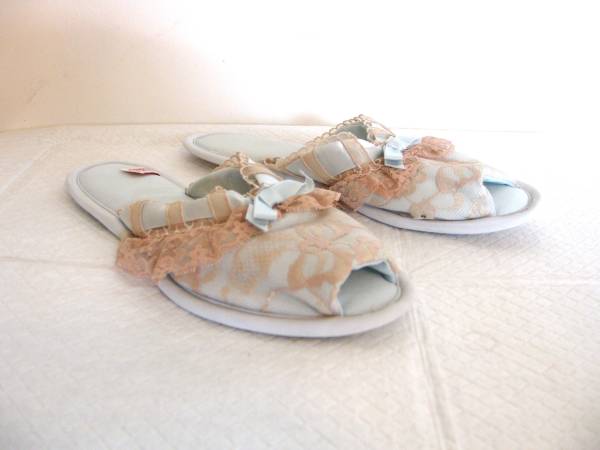 Vintage 1960's peep toe slip on slippers. There's a pink pair and identical powder blue pair. They have a satin ribbon bow and lace on top. These are a size 6.5-7.5 as it says on the bottoms. Please...