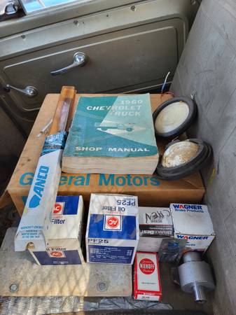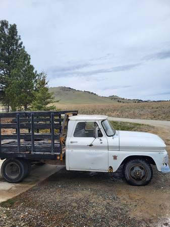 1964 manual Chevy 1 ton Pickup. It is a dually; it has a quality steel flatbed with wooden sideboards. Split rims. Inline six. Wired for trailer brakes. HEI distributor. Spare wheel. Great winter project truck or even a great truck to swap the flatbed onto your truck. Comes with the shop manual and parts in the pictures. Runs and drives, needs some TLC.