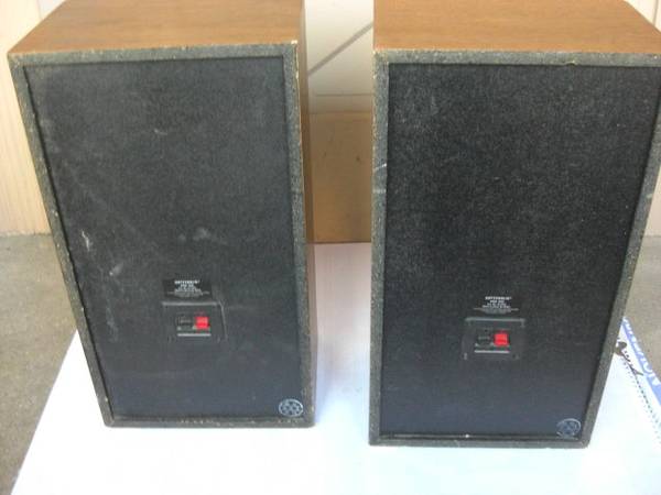 Teak finish; removable grilles; two way: a woofer and a tweeter plus a port for increased bass; cabinets measure approx. 18” high x 9.5” wide x 7” deep; handle 60 watts per channel; comes complete with speaker wire; Radio Shack Cat. No. 40-4041; some nicks and scratches