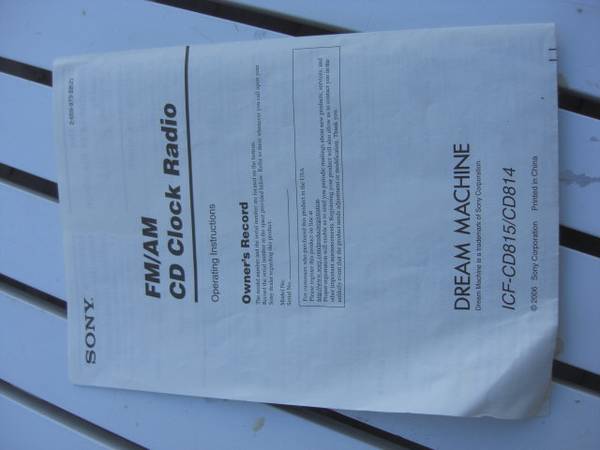 Good looking design piece (black top, white sides)—and it sounds great; Sony Dream Machine Model ICF-CD815; has two side firing speakers; dual alarms; even an audio input so you can plug in an accessory sound device; 3-level adjustable display; snooze button; sleep timer; antenna; includes the original owner’s manual