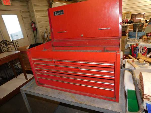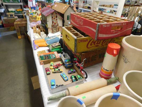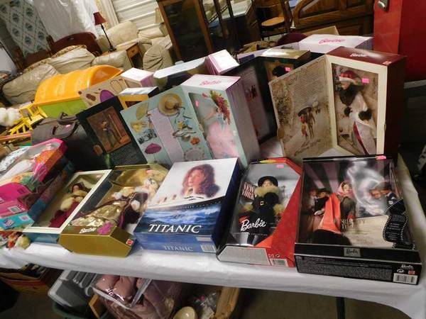 Primitives, Pyrex, Corning ware, linens, lots of stoneware, brass, sterling silver. Cookie Jars, Lots of Glassware and pottery. Old toys, Fisher Price Little People Sets, old doll houses, matchbox and Tonkas, Barbie Collection. Large Chest Freezer. Tools, Snap-On toolbox, Toyota toolbox.