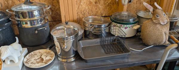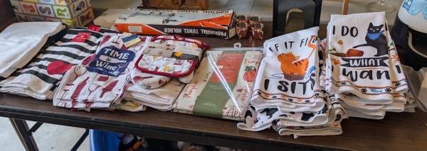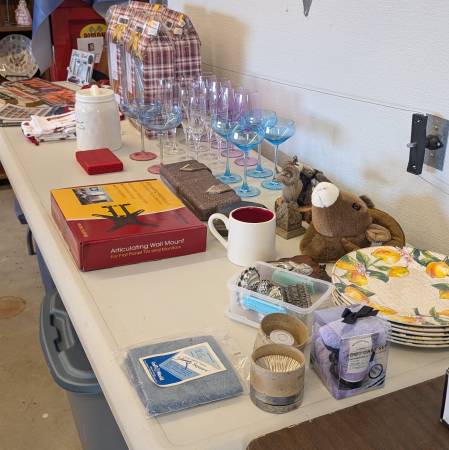 Huge sale. New appliances still in boxes. Wine lovers stuff. Crafts and holiday items. Christmas trees still in the box. Household items. Beautiful framed artwork. Small furniture pieces. Way too much stuff to list.