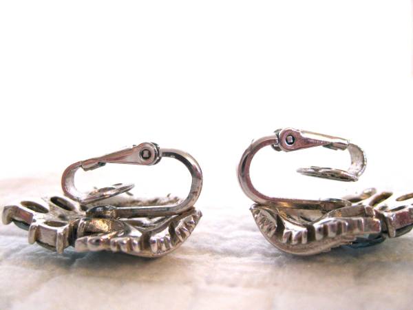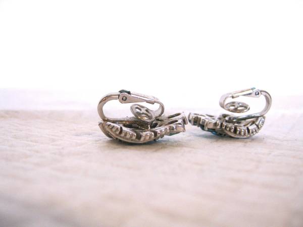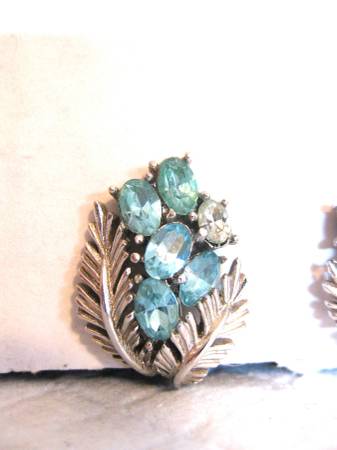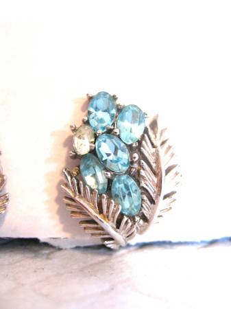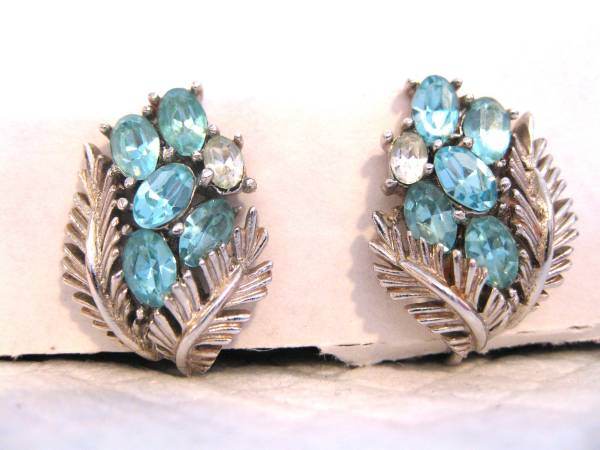 Vintage Trifari earrings. They have 12 rhinestones all together, 6 in each earring. The earrings are oval and there's 5 light blue stones with 1 clear stone off to the side. Each earring is bordered with feather type leaves and are in a prong setting. They are clip on earrings. One clip needs to be adjusted. They measure 1''. Please email if interested.