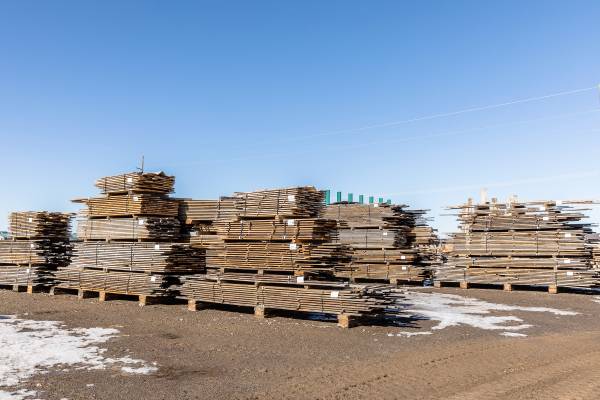 Neatly stacked bundles of lumber at bargain prices. They range in price from $0.75 to $5 per board foot and from 50 to 400 board feet in volume.
