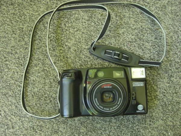 Minolta’s Freedom Zoom 90; multibeam auto focus—just point and shoot; zooms from 38 to 90mm; also has macro lens feature; possessed of Minolta’s legendary crisp optics; manufactured in Japan, circa 1980s; built-in flash; tripod screw; runs off two lithium 6V batteries (2CR5) that are widely available; PLUS comes with Minolta neck strap and a fitted carry case that closes with both Velcro and a secure closure; “Fotom” case has both a shoulder strap and a belt loop; clean; very good condition