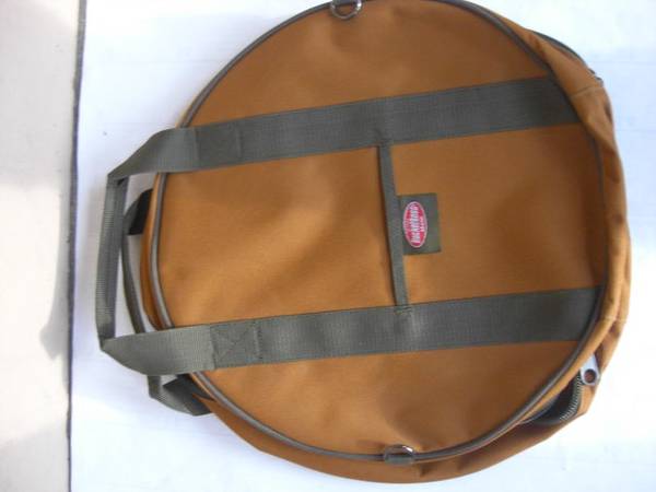 A place for everything and everything in its place, including your jumper cables! The quality you have come to expect from Bucket Boss; jumper cables bag also holds tow straps, air hoses, ropes and extension cords; never used; main compartment has a full zipper closure; solves the problem of dealing with hard to coil, often greasy and dirty, cables and clamps; web carry handles; two outer exterior storage pockets, one of which closes with Velcro; made of heavy duty nylon material; measures approx. 15" across