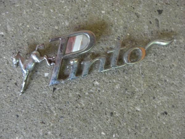 Ford Pinto vintage script emblem logo badge $50 Metal; OEM nameplate is approx. 6 ½”” long; both mounting studs present; probably fits all seventies models of this subcompact