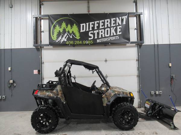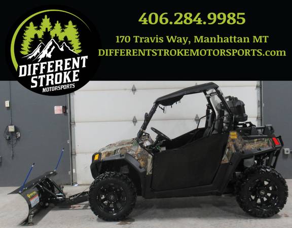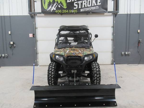 Accessories: Poly Tip-Out Windshield, Rearview Mirror, Sideview Mirror, Poly Rear Panel, Poly Roof, Roof Mounted Storage Pouch, Half Metal Doors, 3,500lb Polaris HD Winch with Synthetic Rope, New 60" Open Trail Steel Snowplow, Rear Bumper, Sedona 14" Rims, Aftermarket Muffler, Fender Flares.