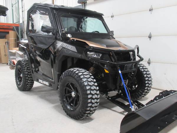 Accessories: 14" MSA Wheels, 30" Tires, New Seizmik Upper Doors (Zip Open), Glass Windshield, Tinted Poly Rear Panel, Poly Roof with Insulation, Heater with Defrost Vents, Rearview Mirror, Side View Mirrors, Ryco Blinkers, Front Bumper, High Clearance Front A-Arms, Polaris 4,500lb Winch, New 66" Open Trail Snowplow, Lighted License Plate Bracket, PRP Storage Bags, Horn.