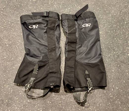 Used outdoor research men’s waterproof verglas gaiters. Normal wear, no stitching rips, no holes, clasps/hooks/velcro all work well. Men’s size small.