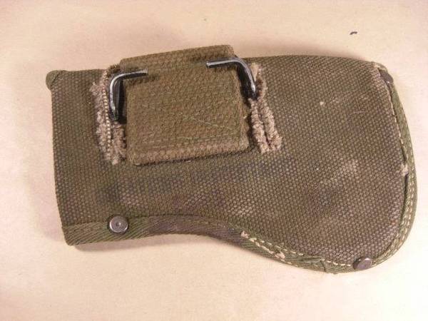 U.S. Army hand axe vintage carrier hatchet cover $40 WWII vintage; very good condition; heavy duck material; snaps closed; attaches to belt with clip; approx. 6 ½" wide x 4" tapering to 3 ¼"