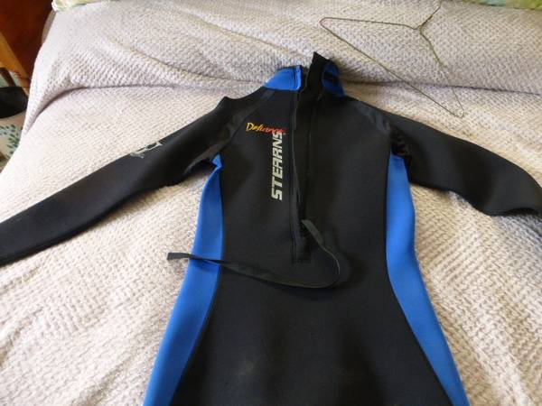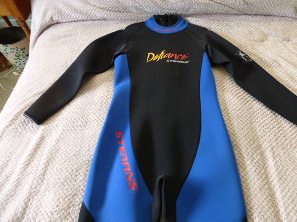 The second is a Stearns Defiance 3mm full wet suit. It is a large and the inseam is 27 inches. It has a heavy duty back zipper with long pull strap, and rubberized wrist, ankle and neck cuffs. It also has rubberized knee pads. It is accented with a light blue side.