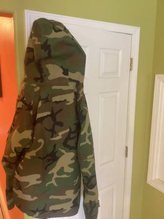 Light weight, wind proof, water proof. Size XL regular. Has strong metal buttons and zipper for better protection. The material is similar to Gortex