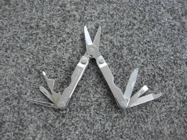 Oiled and sharpened; used; stainless steel; 2 1/2" long when folded into itself; weights 1.7 oz.; tweezers, ruler, bottle opener, micro straight blade screwdriver, 1.5" knife blade, scissors, nail...