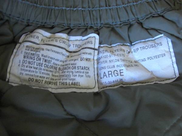 Air Force flyer's trousers; size large; very good condition and clean; two rear pockets; snap-up front, elasticized waist and cuffs; quilted; polyester lining, nylon cover