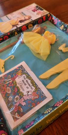 Topper Toys Dawn Sheer Delight #8110 outfit in original package. Comes with dress stand, yellow mini-dress, yellow tights, yellow shoes, yellow hanger, and the wonderful world of Dawn booklet. Box...