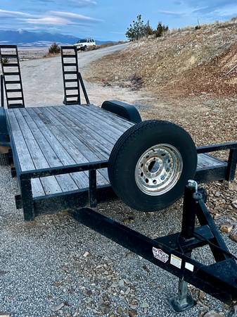 2019 big bubba equipment/ car trailer 16’ + 2’ dove tail with stand up ramps 83.5” between fenders Adjustable knees Tires are excellent Brakes on both 5k axles Lights work Spare